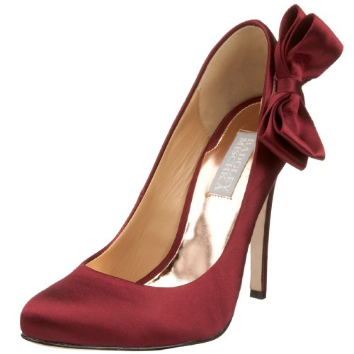 Simple elegance is always a perfect choice, as in these Calton pumps from Badgley Mischka. Satin fabric upper in a dress heel pump style with a plain almond toe. Swooping vamp with low sides. Bow detail on the outer heel. Soft lining with a cushioned footbed. Dress midsole, leather traction outsole, 4 inch satin wrapped stiletto heel.