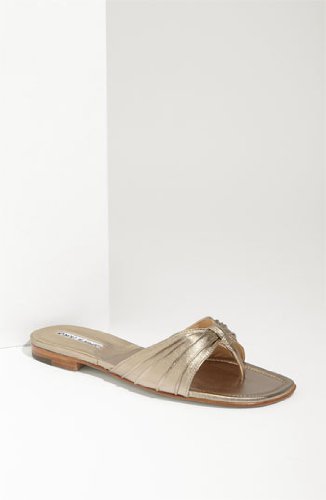 Golden leather folds into a soft knot on a shimmering thong sandal. Color(s): alba russo. Brand: MANOLO BLAHNIK. Style Name: Manolo Blahnik 'Berna' Thong Sandal. Style Number: 504116. Manufacturer part number P BERNA